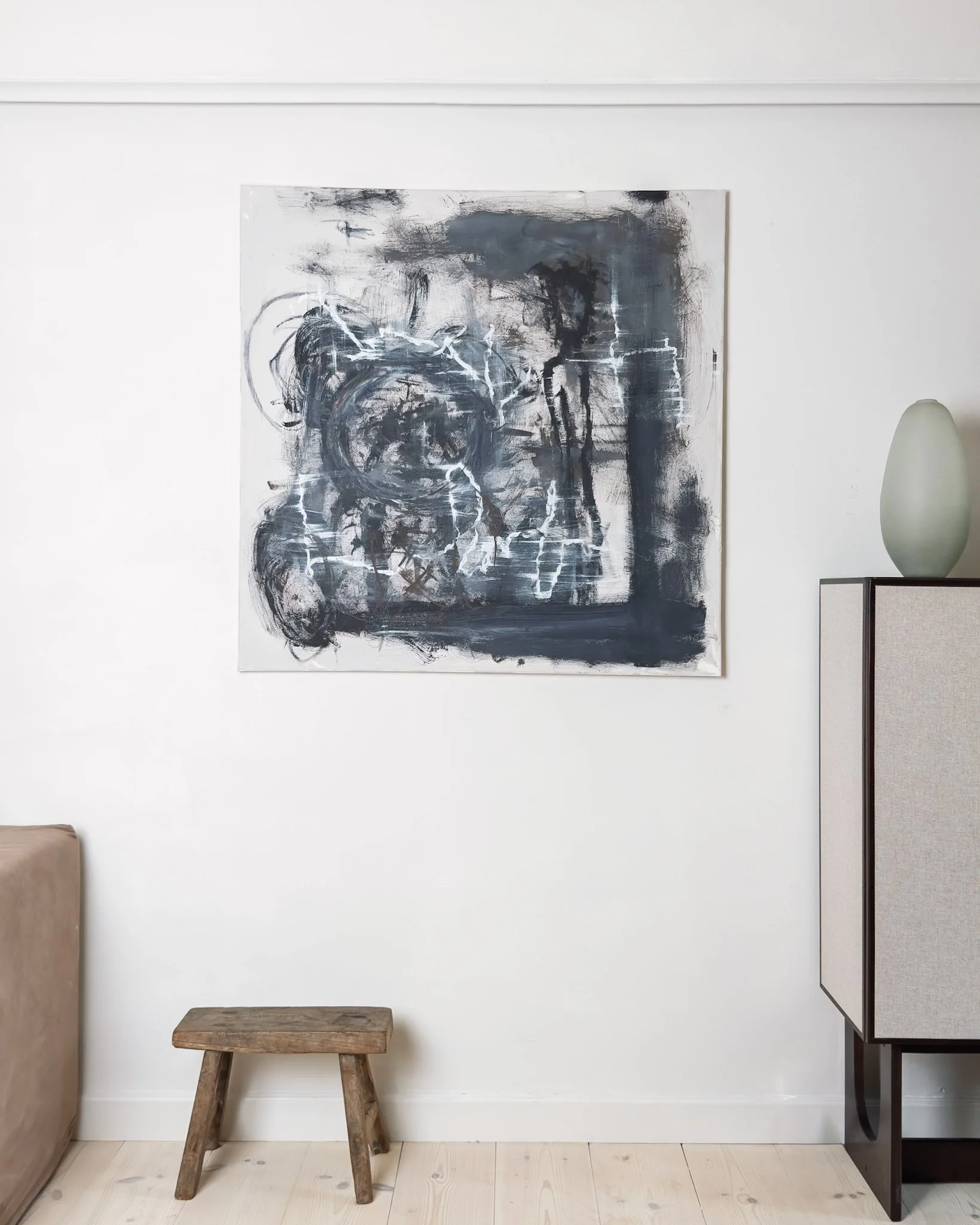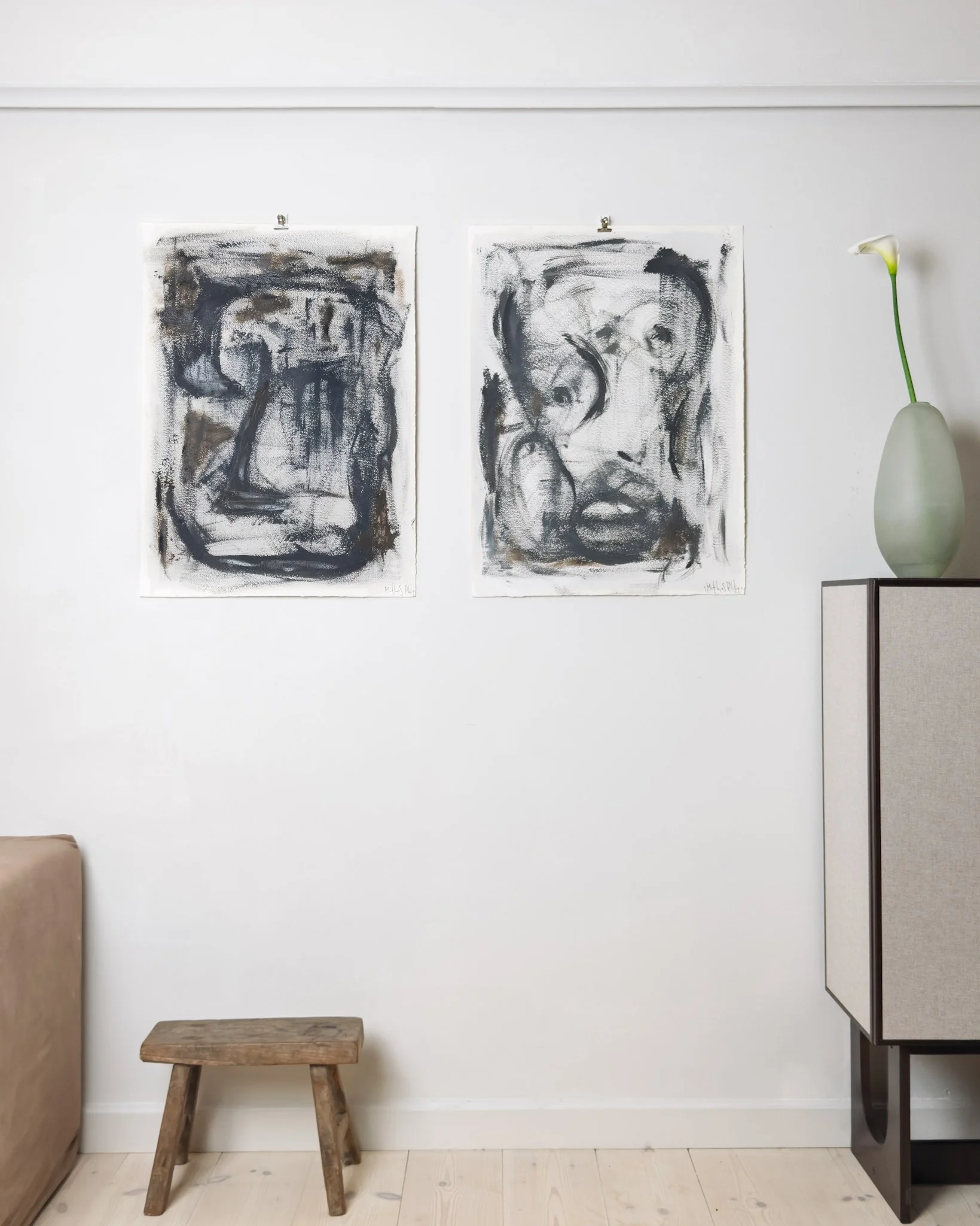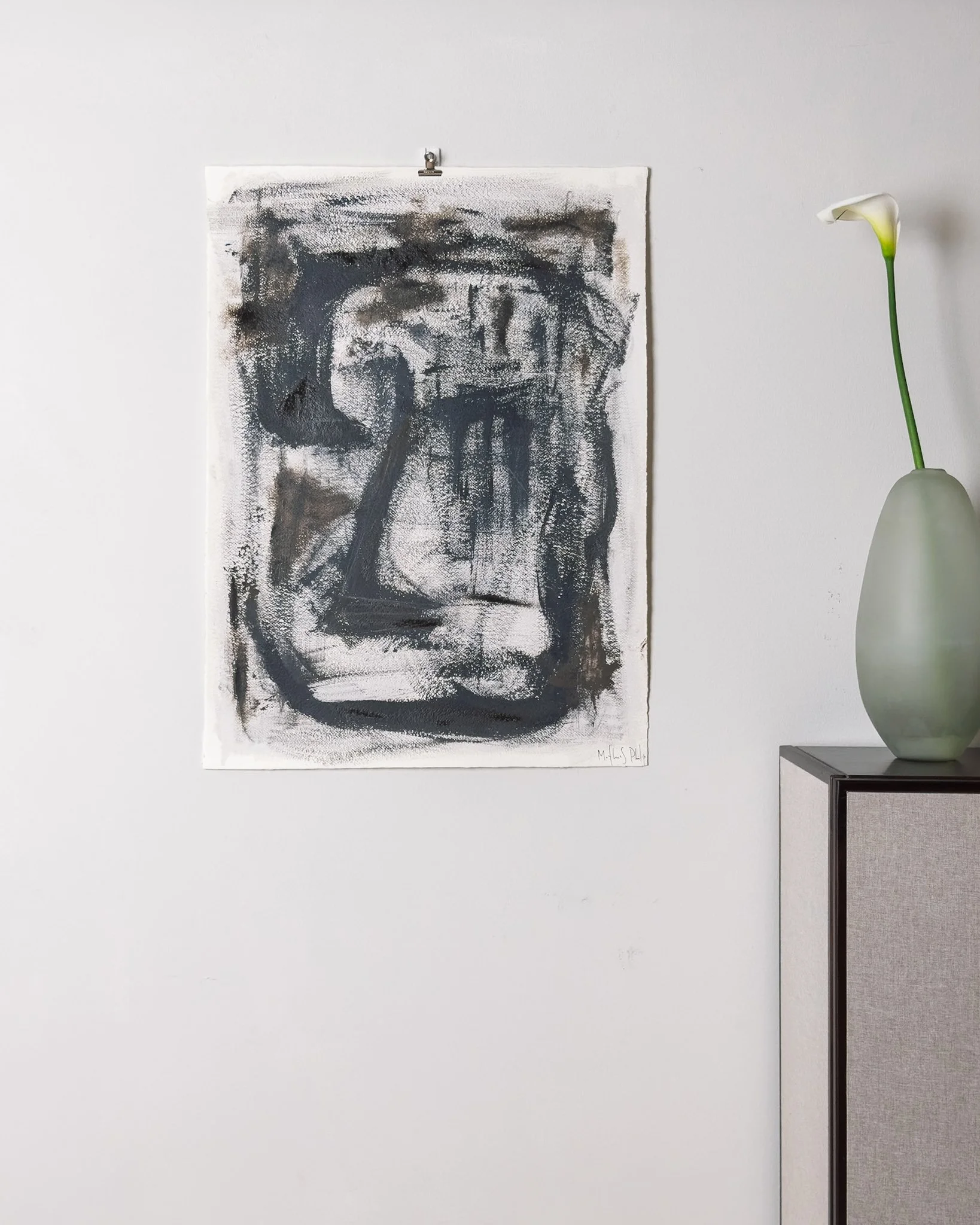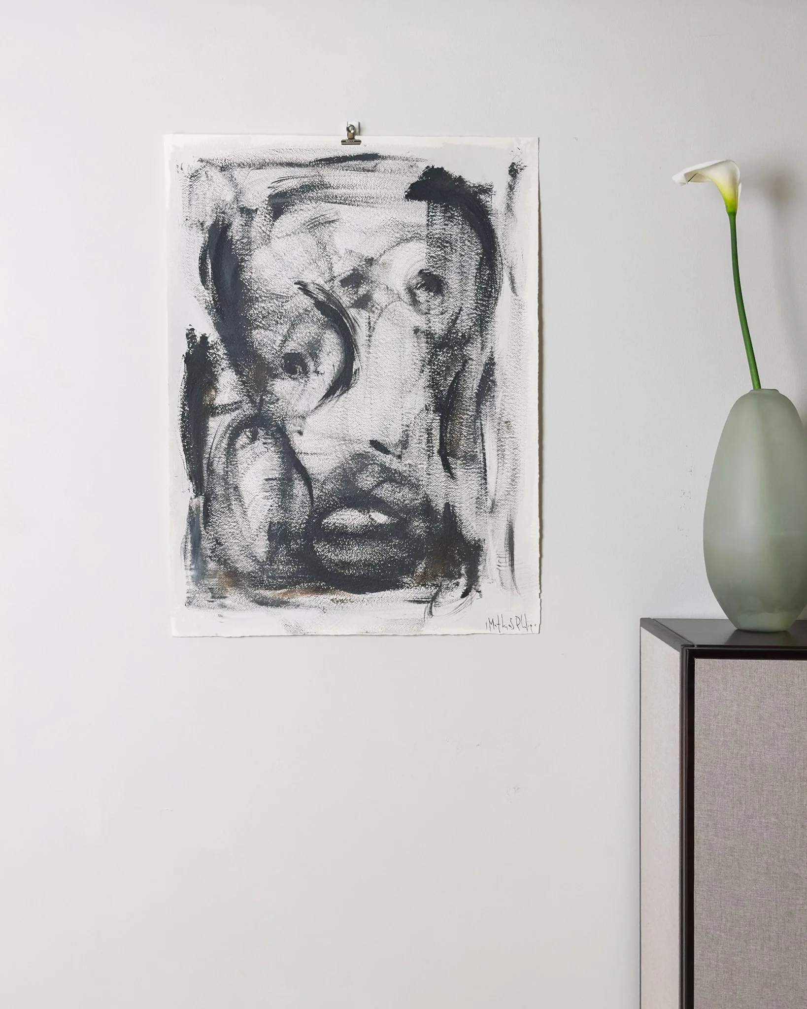 A dark figure emerging through layered washes on a muted ground. An exploration of presence held between appearance and erasure.