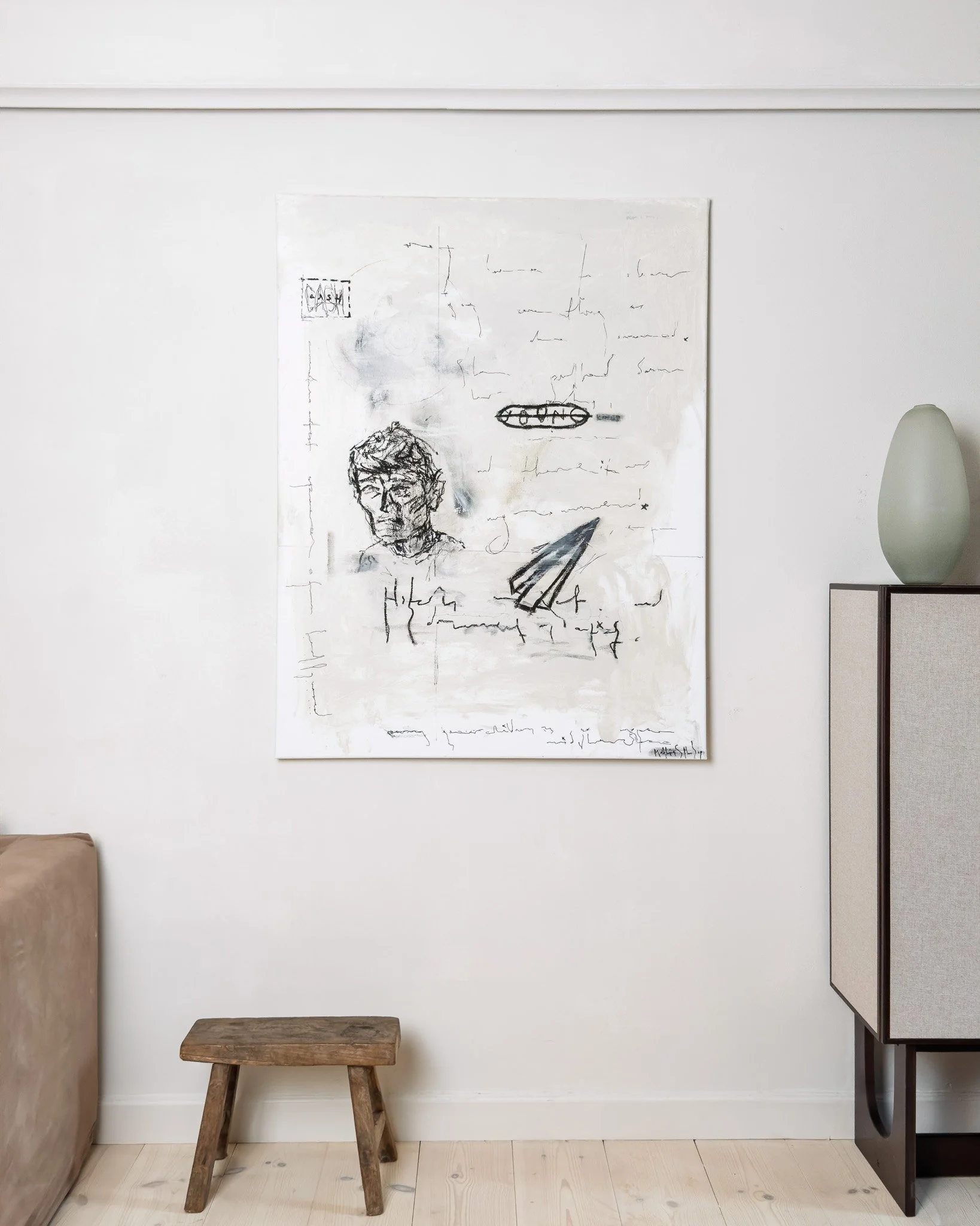 A fragmented figure layered with handwritten traces and a drifting paper airplane. An intimate work exploring identity as something folded, revised, and released.