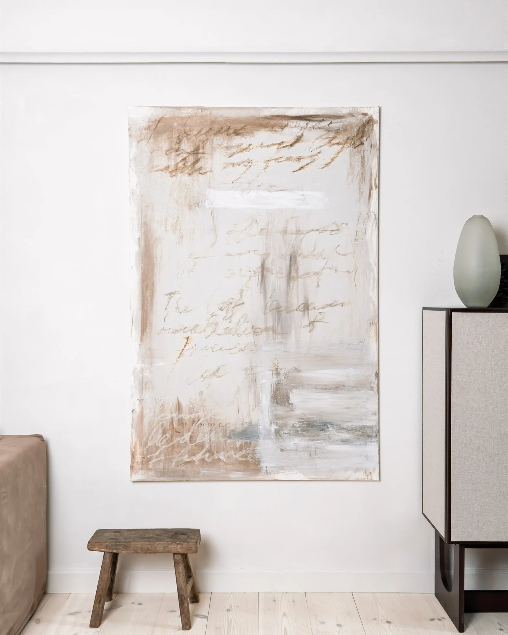 Text partially absorbed into the painted surface. A reflection on memory held between writing and erasure.